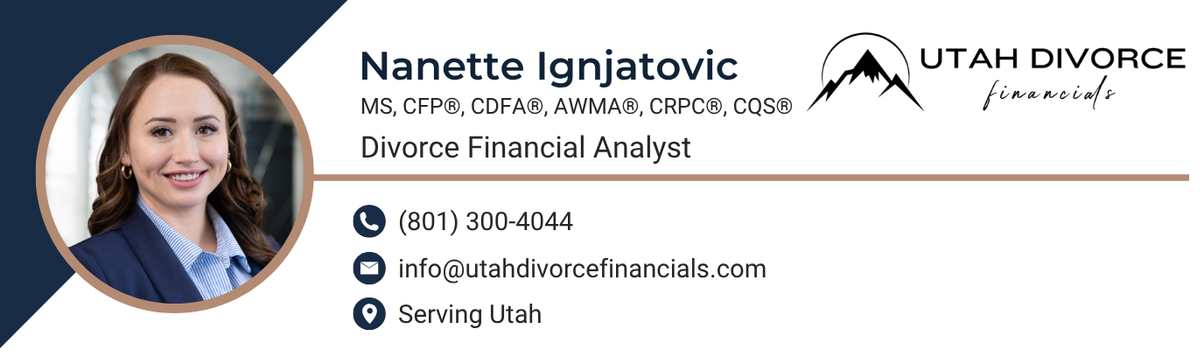 Utah Divorce Financials’ professionals are NOT ATTORNEYS AND DO NOT PROVIDE LEGAL ADVICE. All information is financial in nature and should not be construed or relied upon as legal or tax advice. Individuals seeking legal or tax advice should solicit the counsel of competent legal or tax professionals knowledgeable about divorce laws in their own geographical areas. Divorce financial planning is a fee-only process that does not include investment advice or securities or insurance transactions.